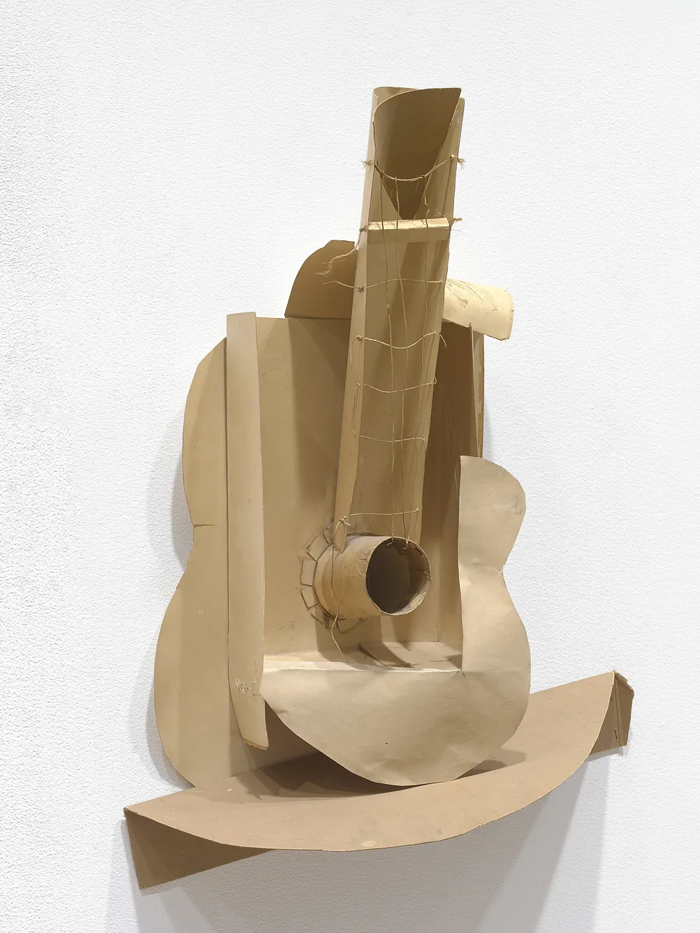 «¿Sabes cómo limpiar sonidos?» escribió Satie en 1913. «Son un asunto sucio».5 Su ingenio irónico se aplica a la noción de materialidad sonora, al igual que el ingenio de Picasso se aplicaba al desmembramiento de las formas. El vacío de la guitarra, ese volumen del que emana volumen, se desata. El recipiente del sonido se abre, se vacía y lo que no es nada se vuelve sólido. Su Guitarra de 1913 en cartón ha sido descrita de diversas maneras como «un nuevo lenguaje escultórico» y «una ruptura crucial en la historia del arte moderno». En cuanto a Picasso, su reacción fue un encogimiento de hombros: «No es nada, es el guitare!«, una despreocupación replicada y amplificada por André Salmon: «Los compartimentos estancos están demolidos. Nos liberamos de la pintura y la escultura, que ya han sido liberadas de la tiranía de los géneros. No es ni esto ni aquello. No es nada. Es el guitare!«6